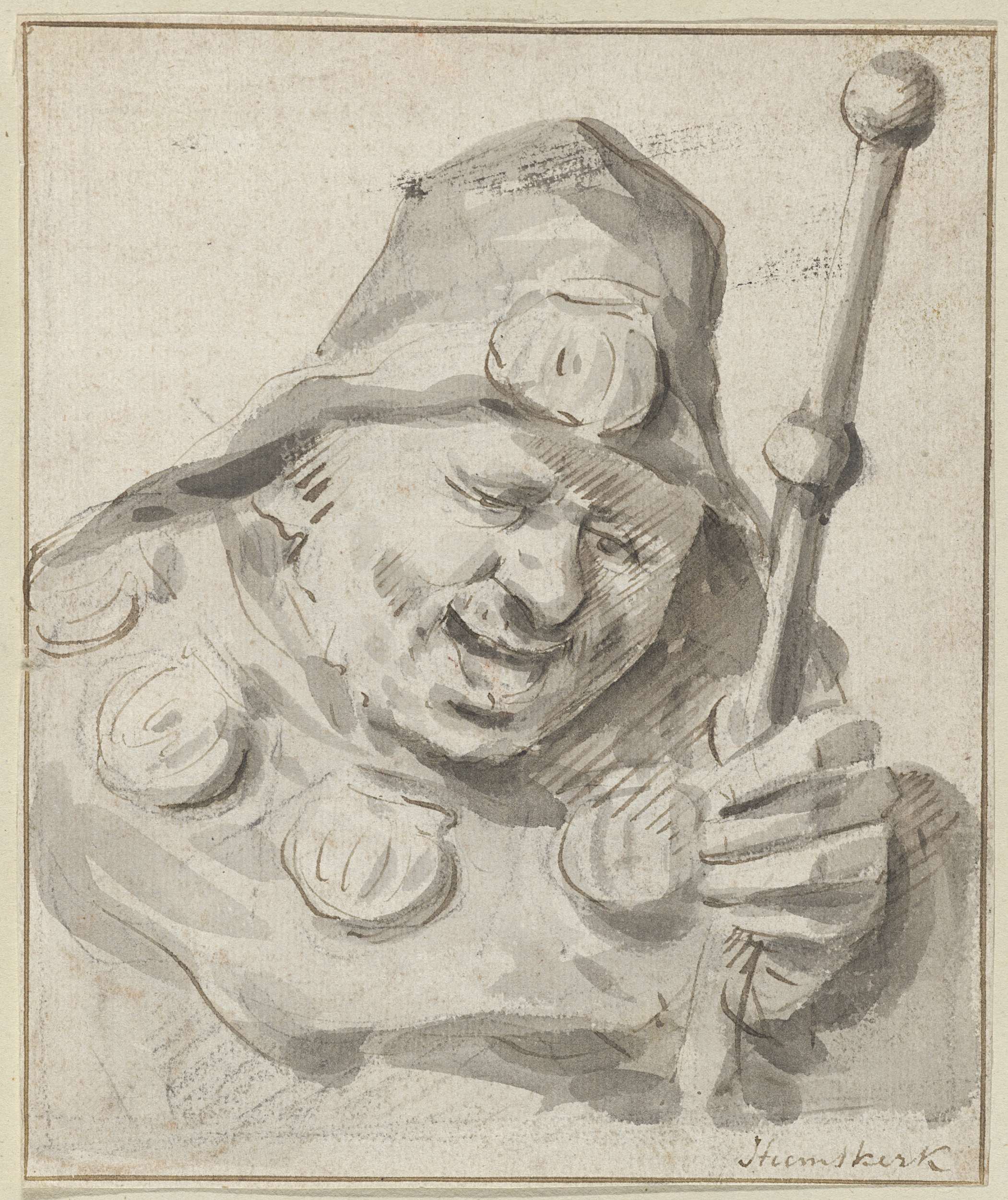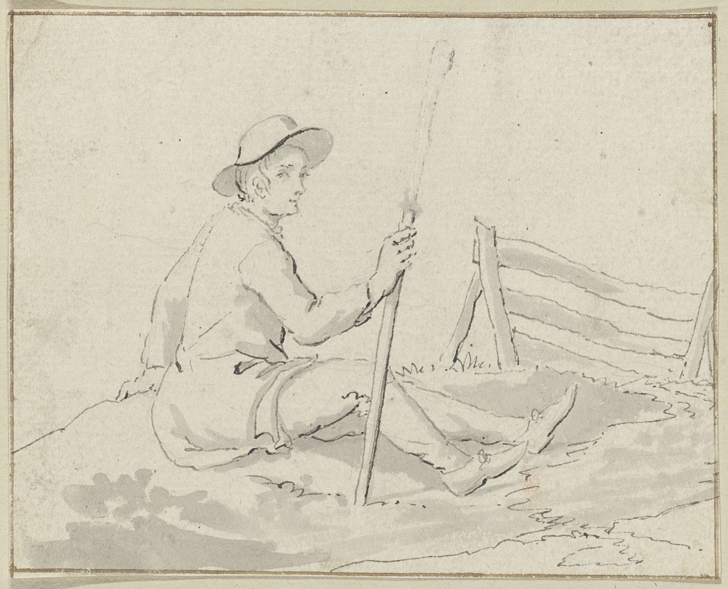 Zittende man met hoed en stok