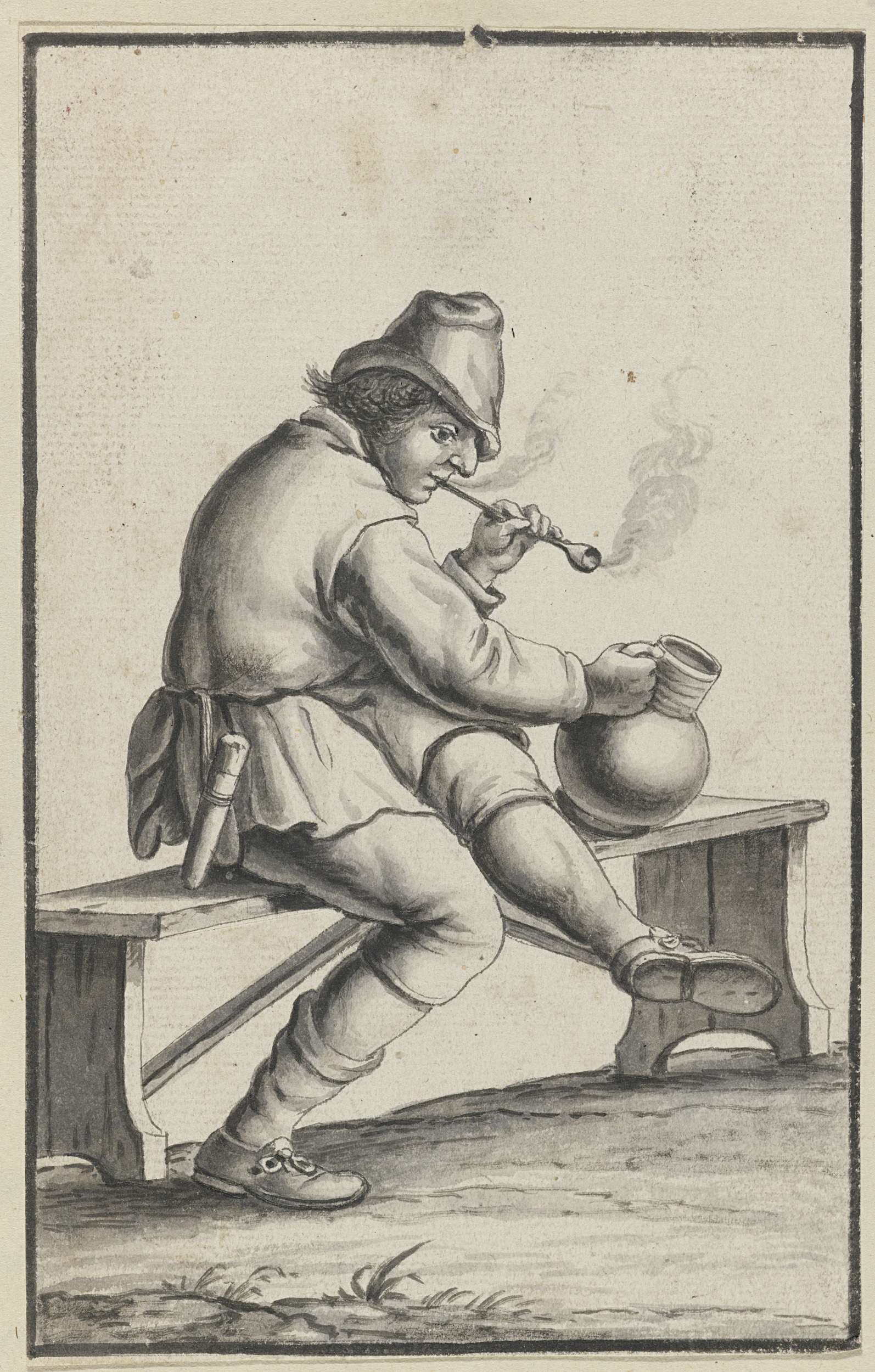 Pijprokende man met kruik zittend op een houten bank