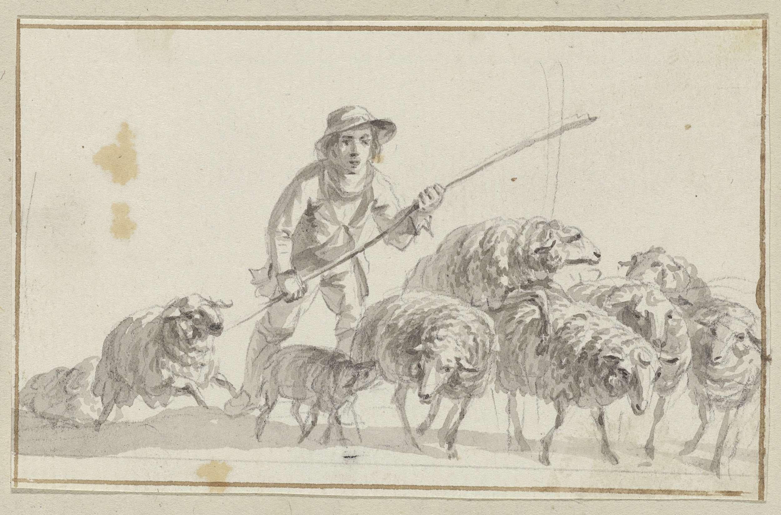 Fluitspelende herder staand bij zijn kudde