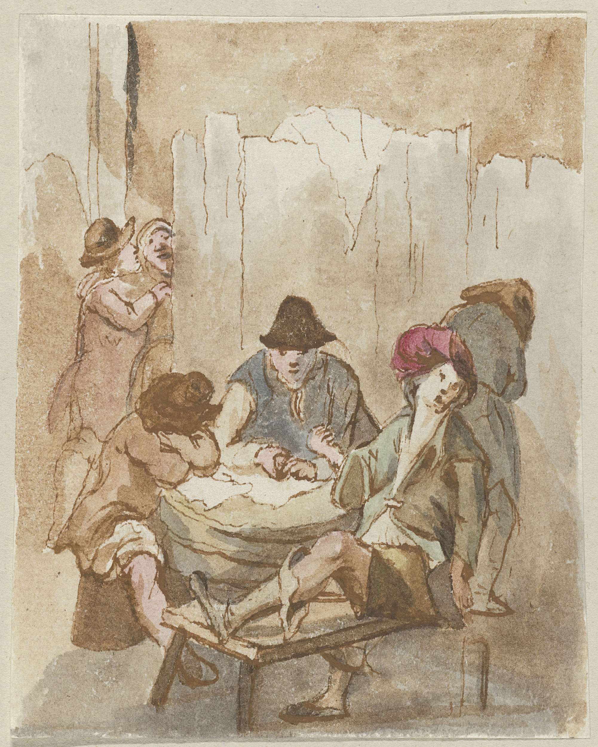Gezelschap van drie mannen en vier vrouwen