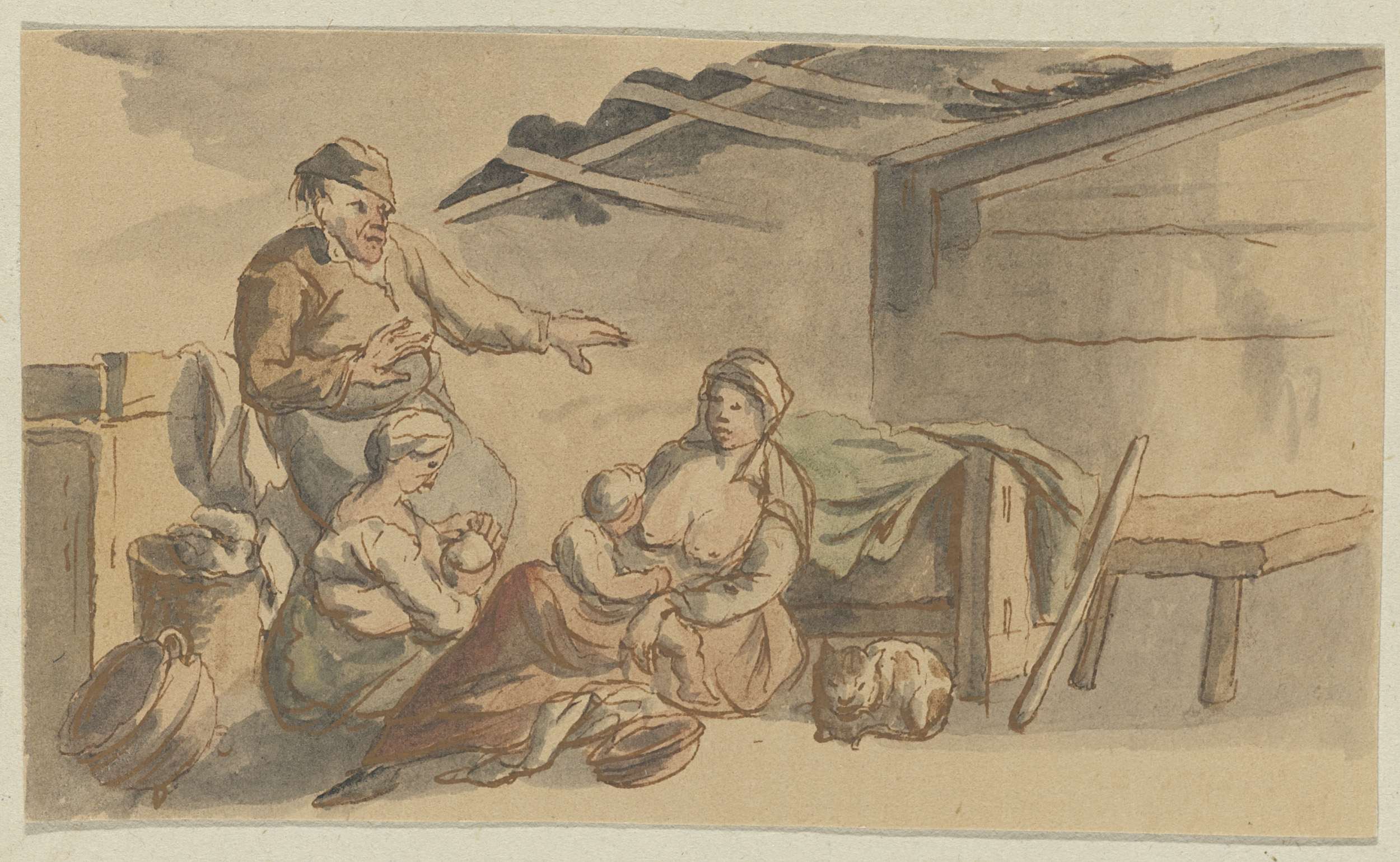 Interieur met twee voedende vrouwen, twee kinderen, ...