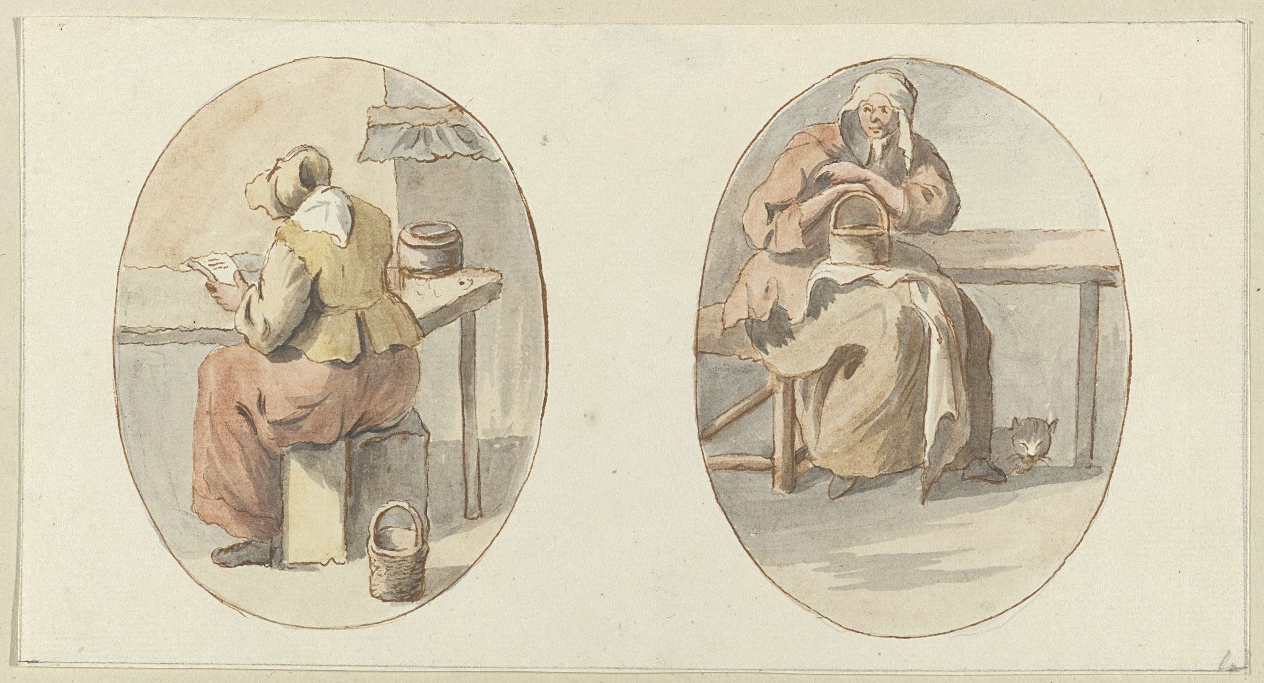Zittende vrouw met brief en zittende vrouw met kat