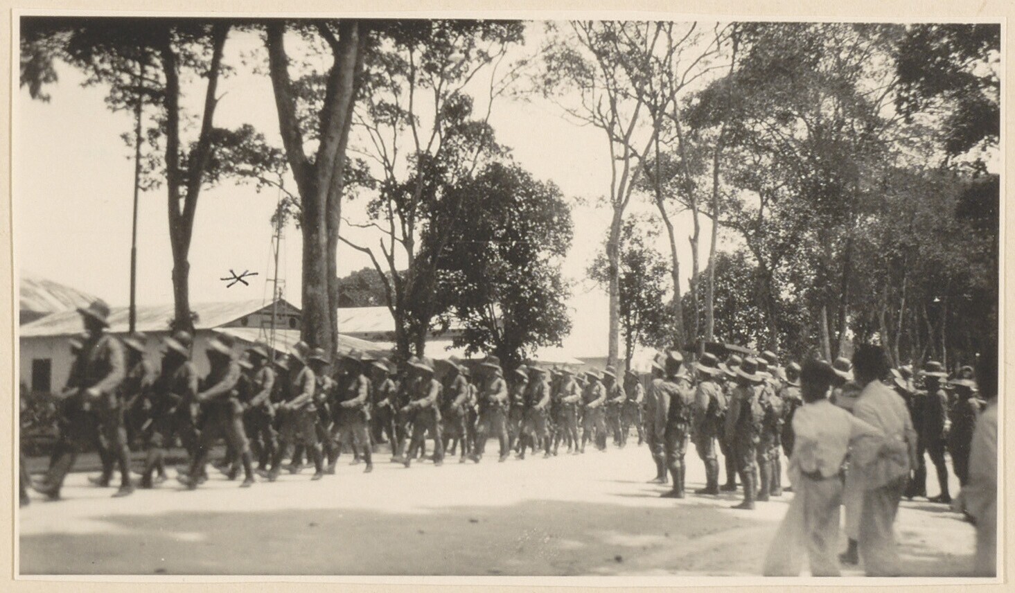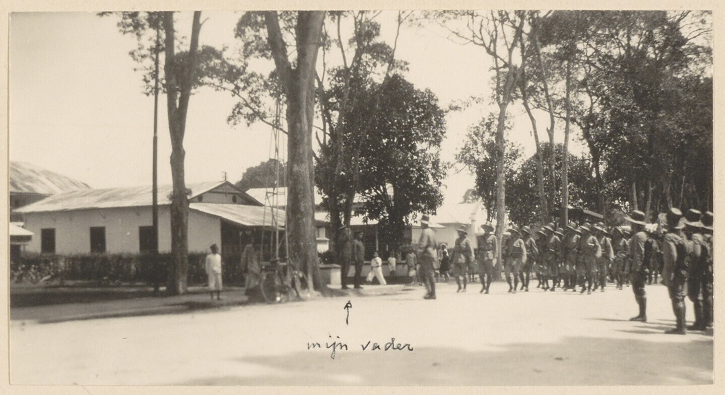 Bataljon Nederlands leger loopt langs huis majoor M....