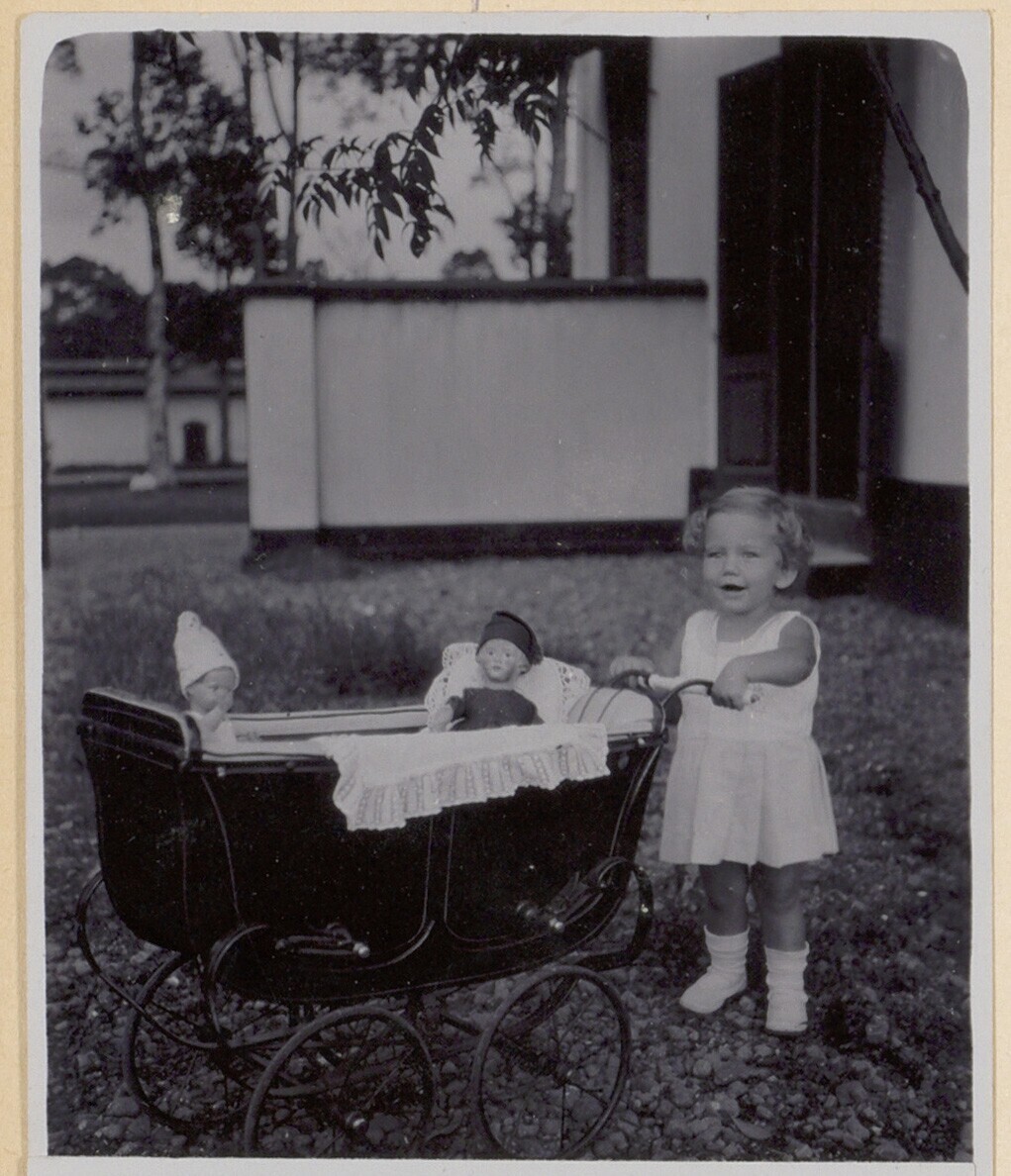 Europees kindje 'zusje Wevers' met poppenwagen in tu...