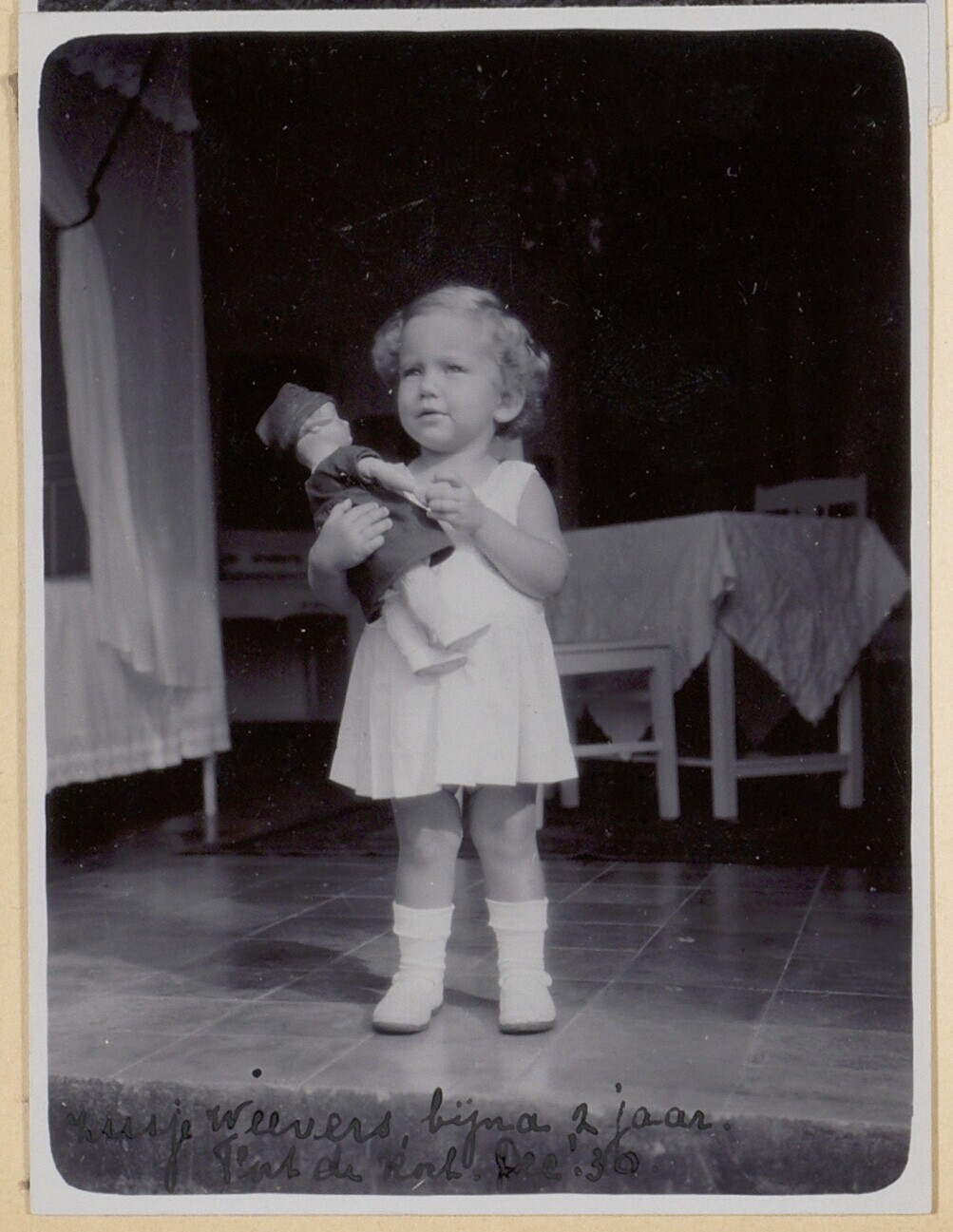 Europees kindje 'zusje Wevers' met pop in kamer. Dec...