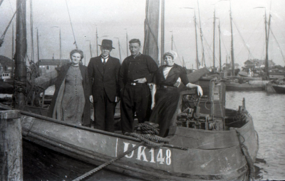 Twee mannen en twee vrouwen op een Urker schip. Eén ...