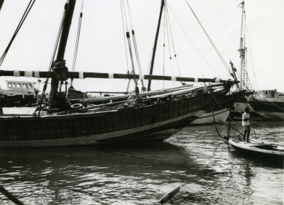 Centraal twee schepen, afgemeerd, stuurboordzijde, e...