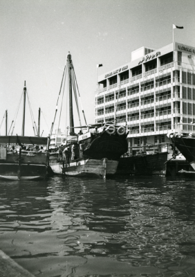 Een Dhangi, afgemeerd voor de National Bank of Dubai...
