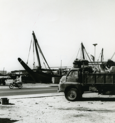 Een Bûm, afgemeerd, een vrachtwagen met lading?