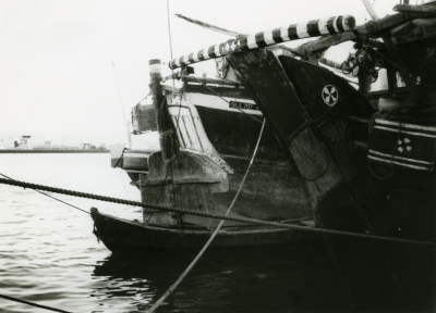 Een schip, afgemeerd, blik op het heck met het roer