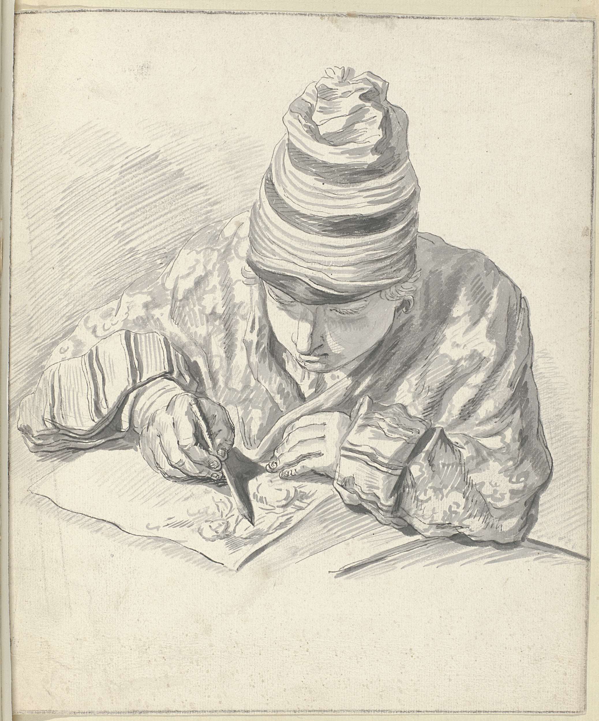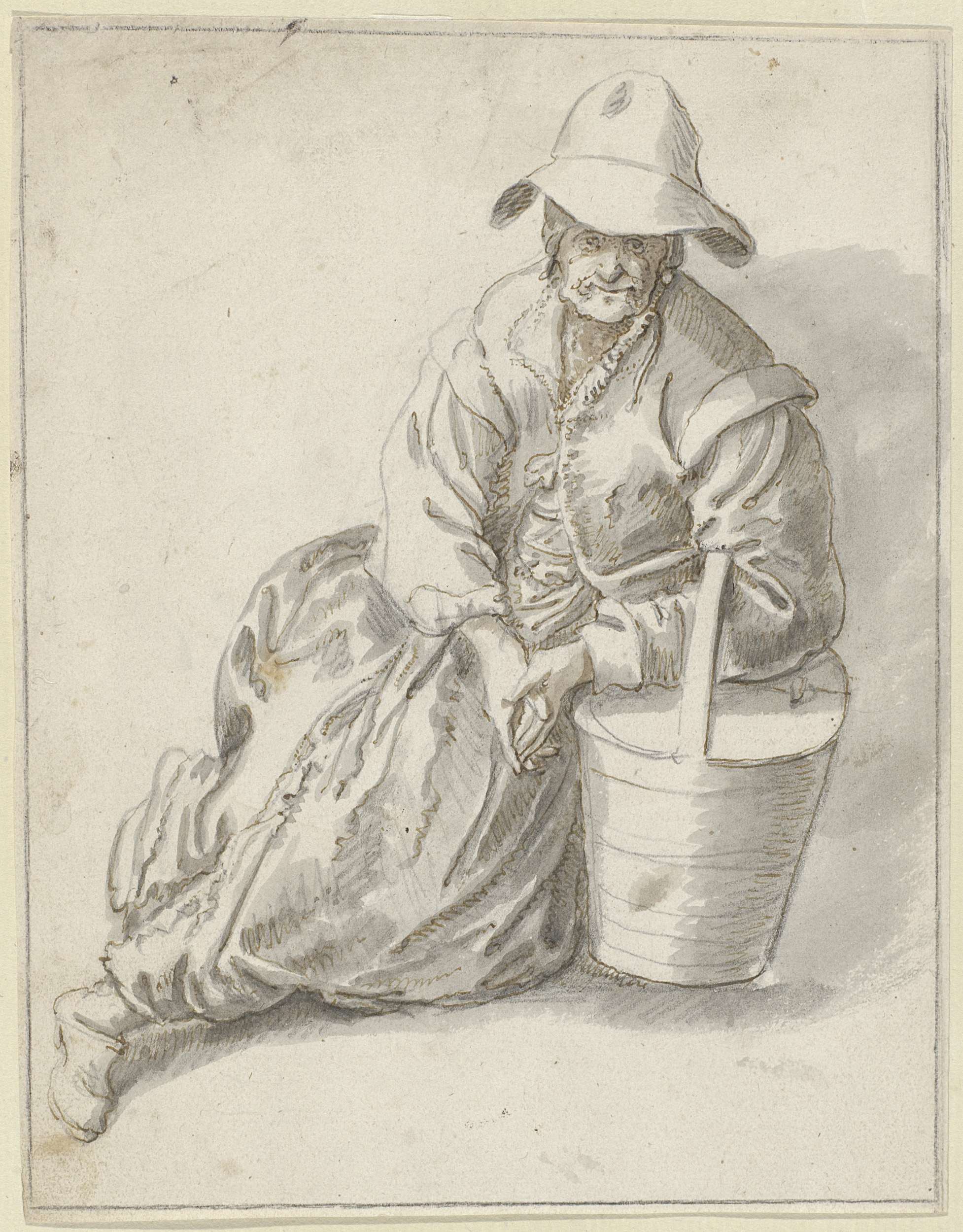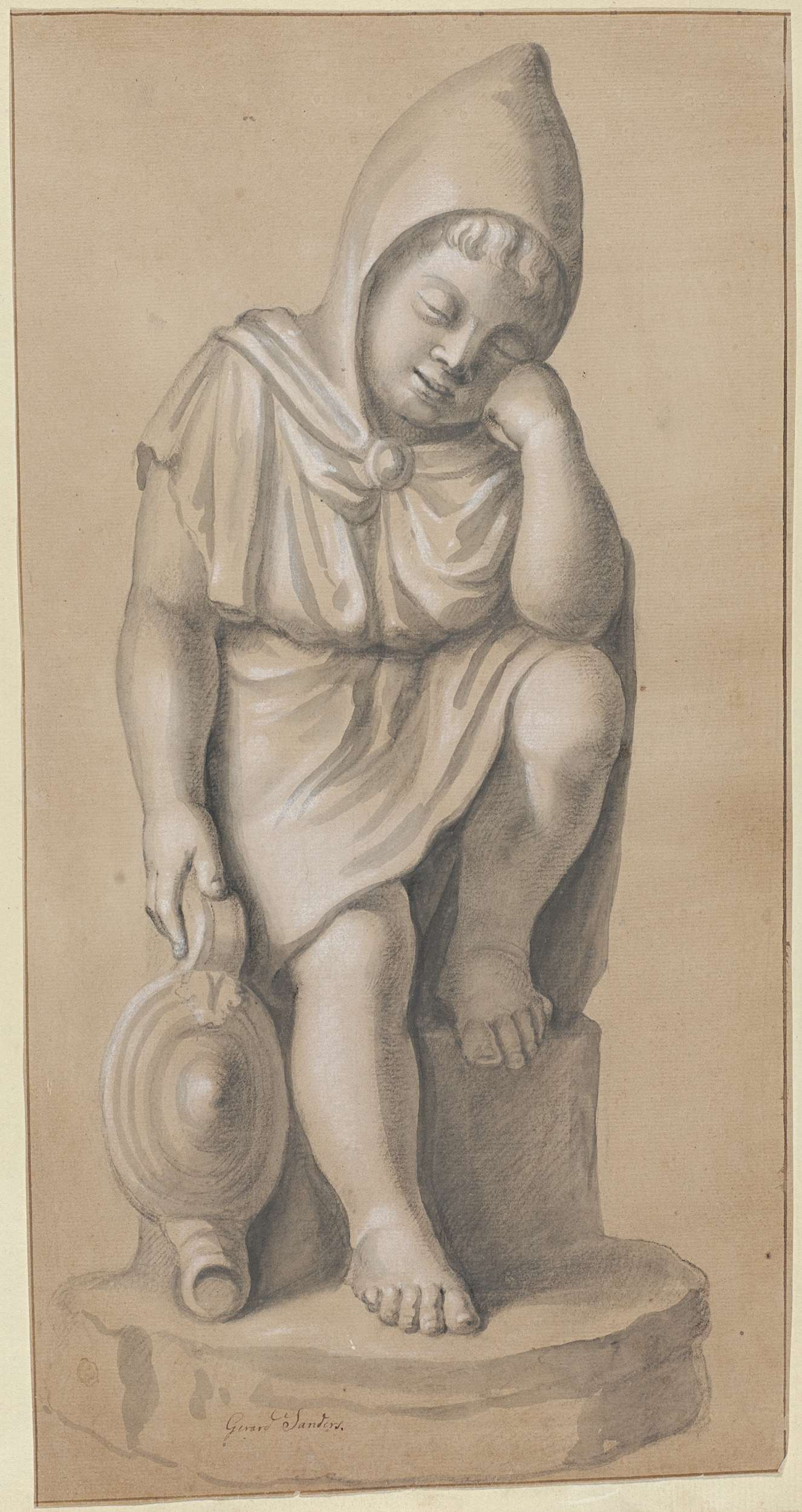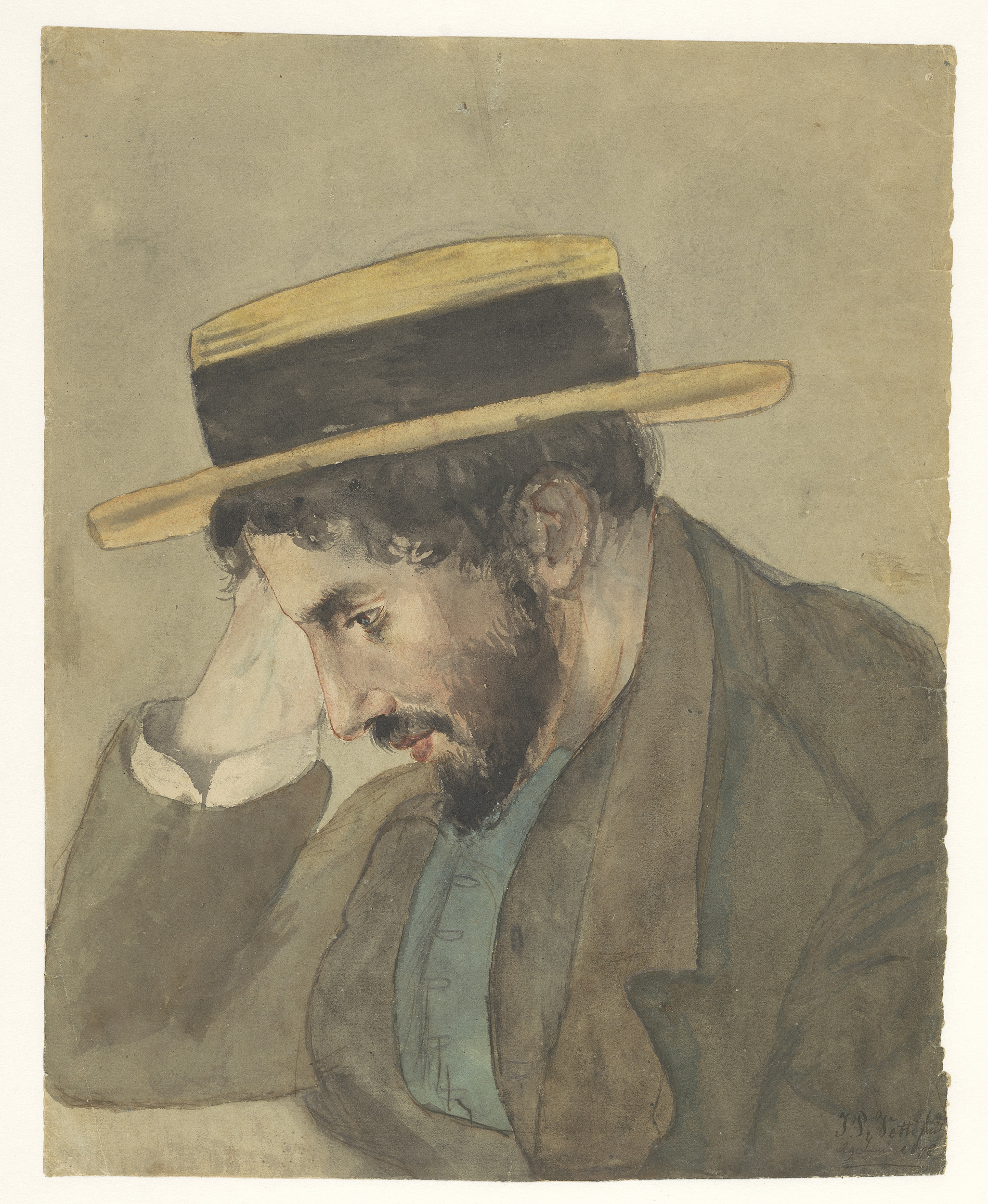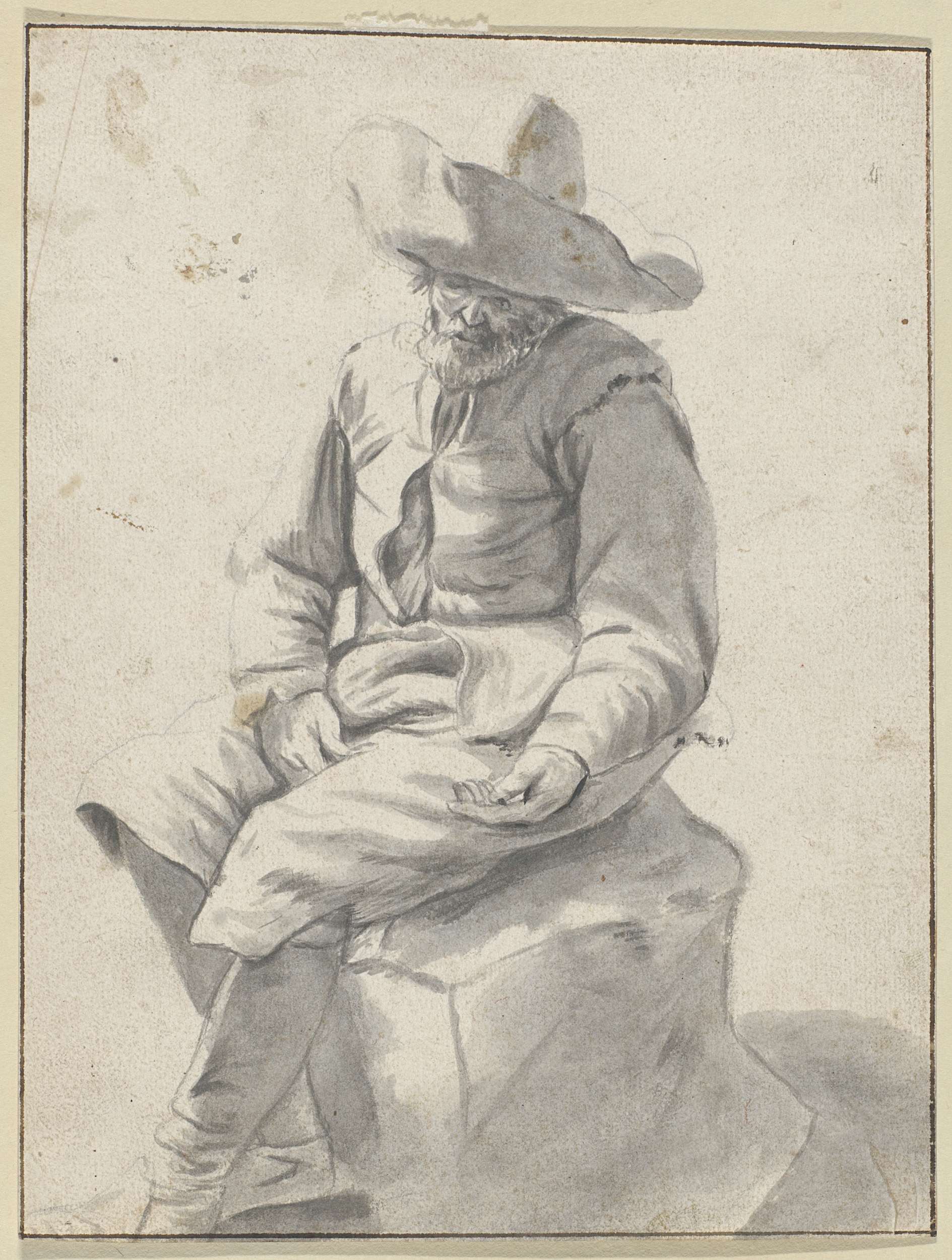 Zittende naakte man, zijn hoofd met zijn hand onders...