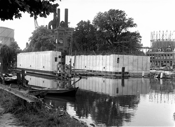 Bouw van fundering Sint Sebastiaansbrug in Delft, 1960