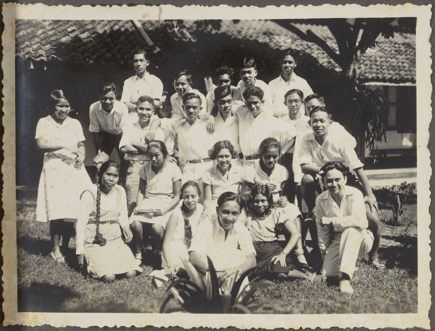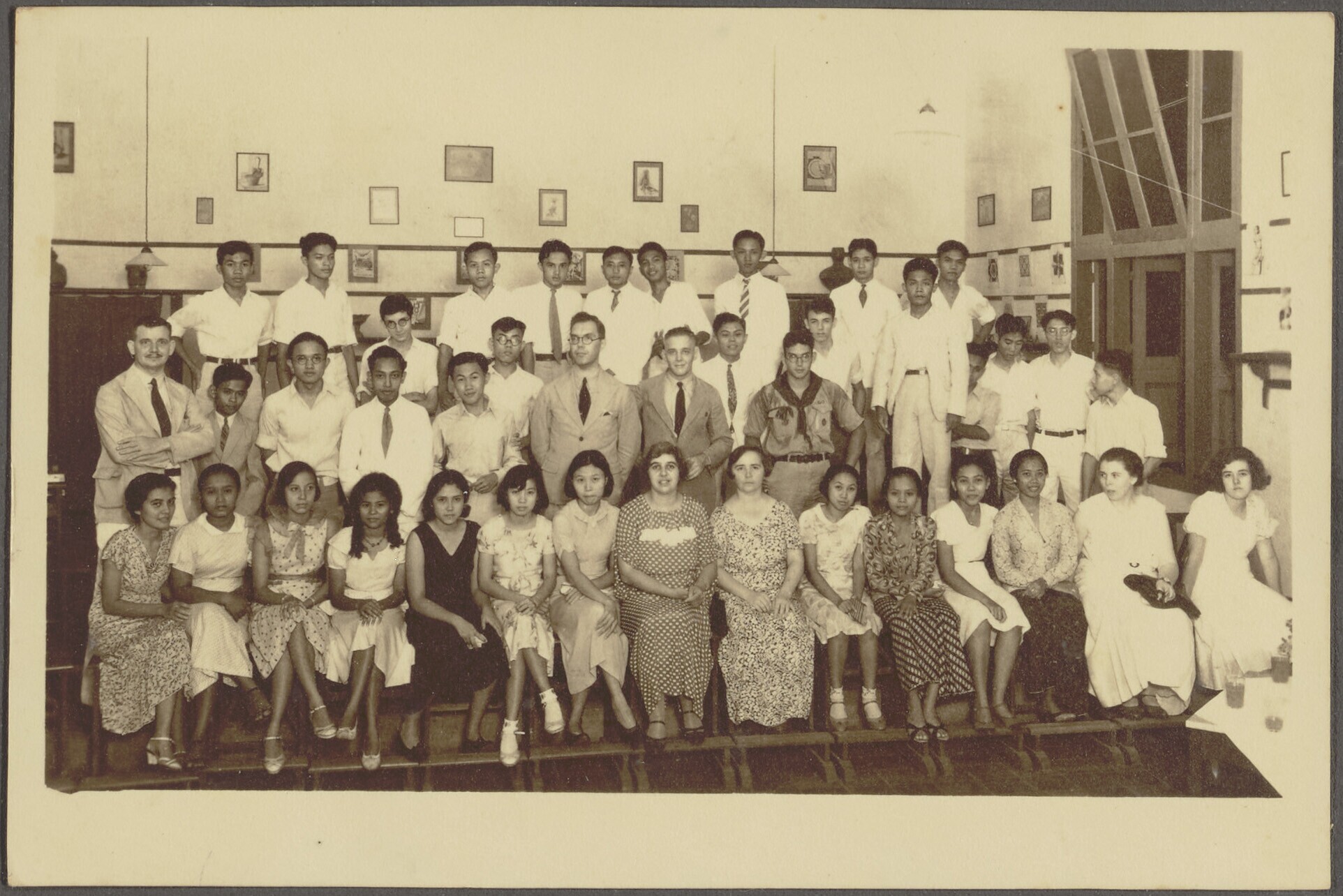 Schoolfoto met vooraan de vrouwen en achteraan de ma...