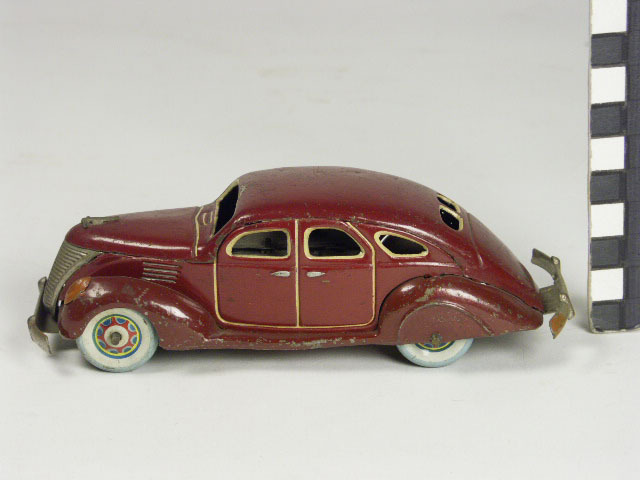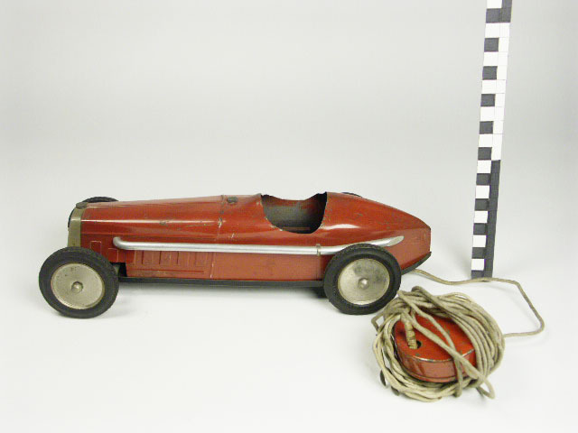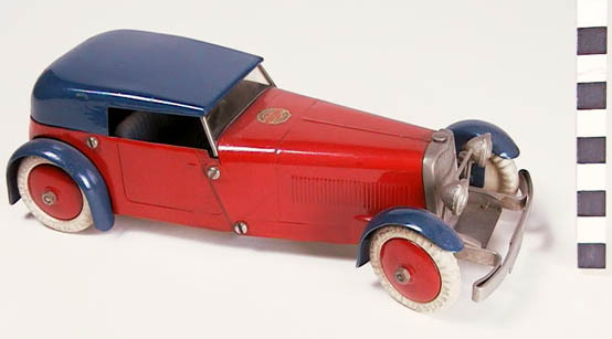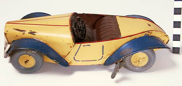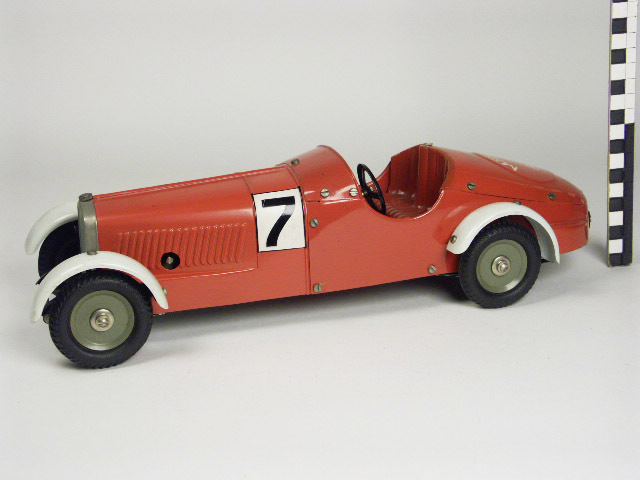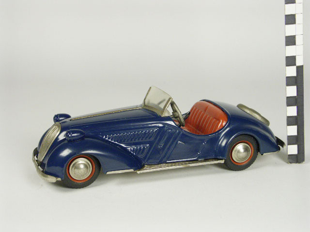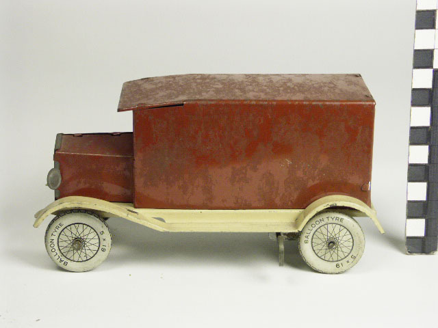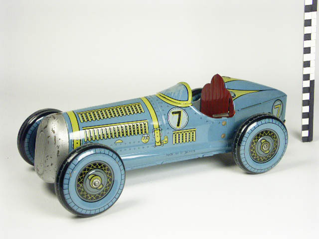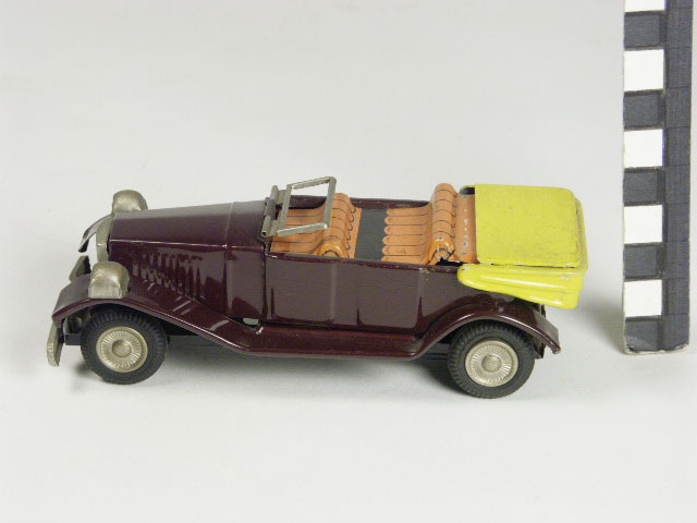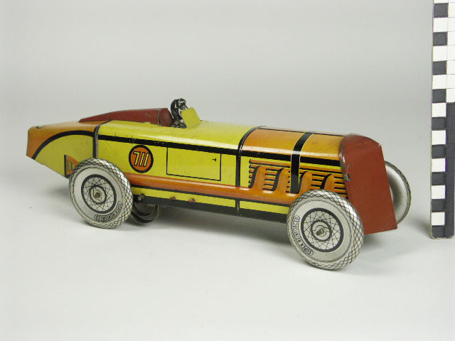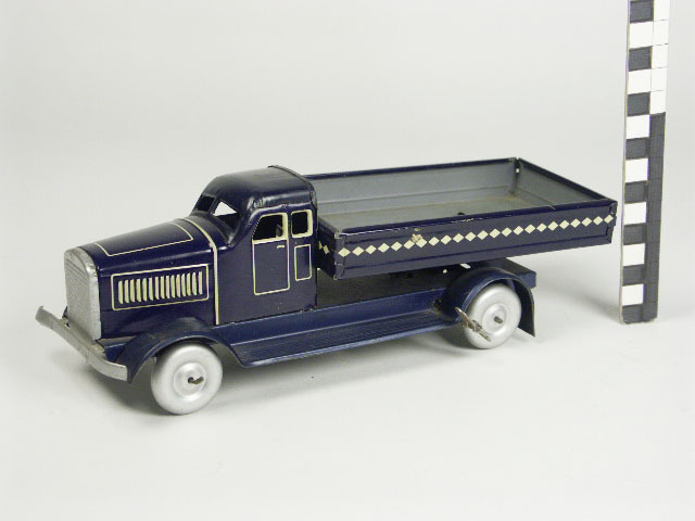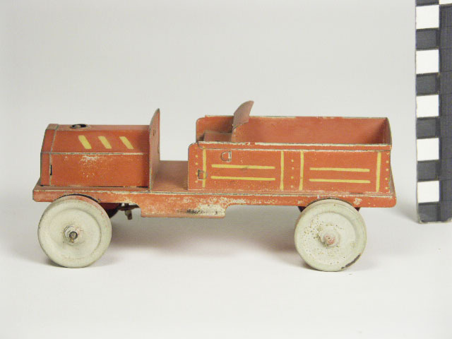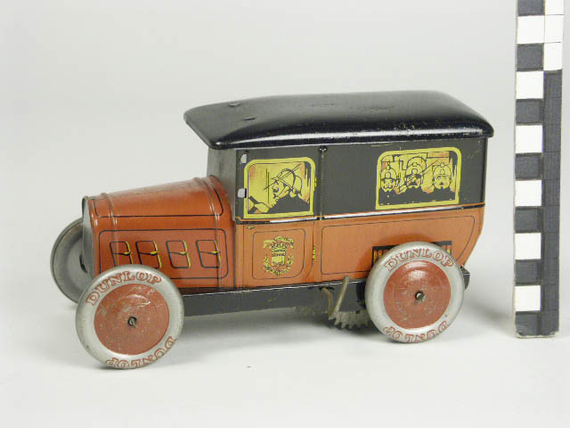 Blikken brandweerwagen met bandweermannen, gedrukt o...