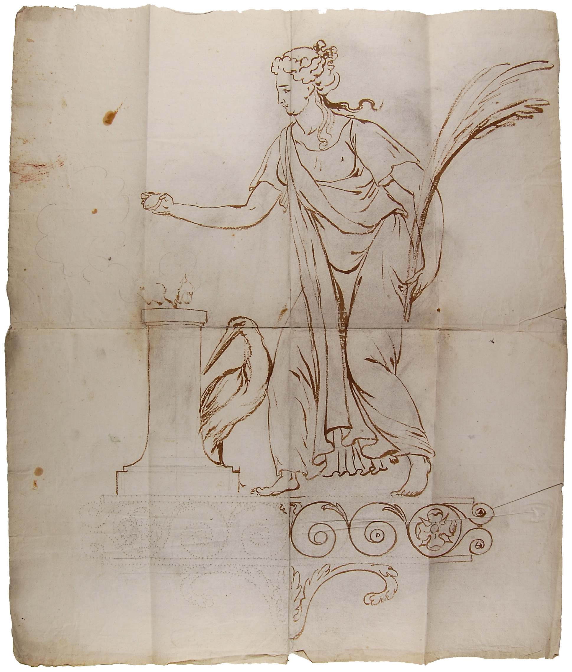 Offerende vrouw in klassiek gewaad met ooievaar en p...