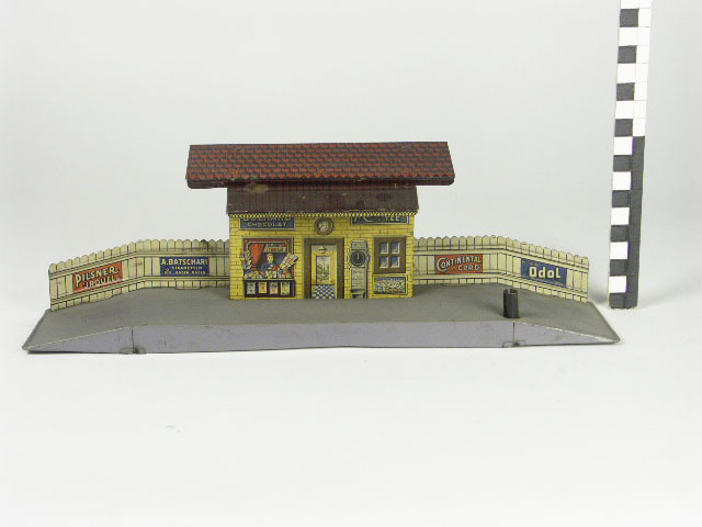 Perron met stationsgebouw en reclameborden