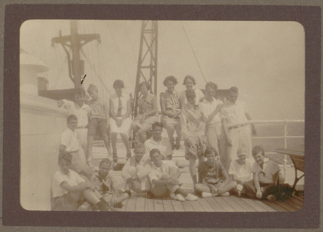 Vriendengroep poseert aan boord van een pleziervaartuig