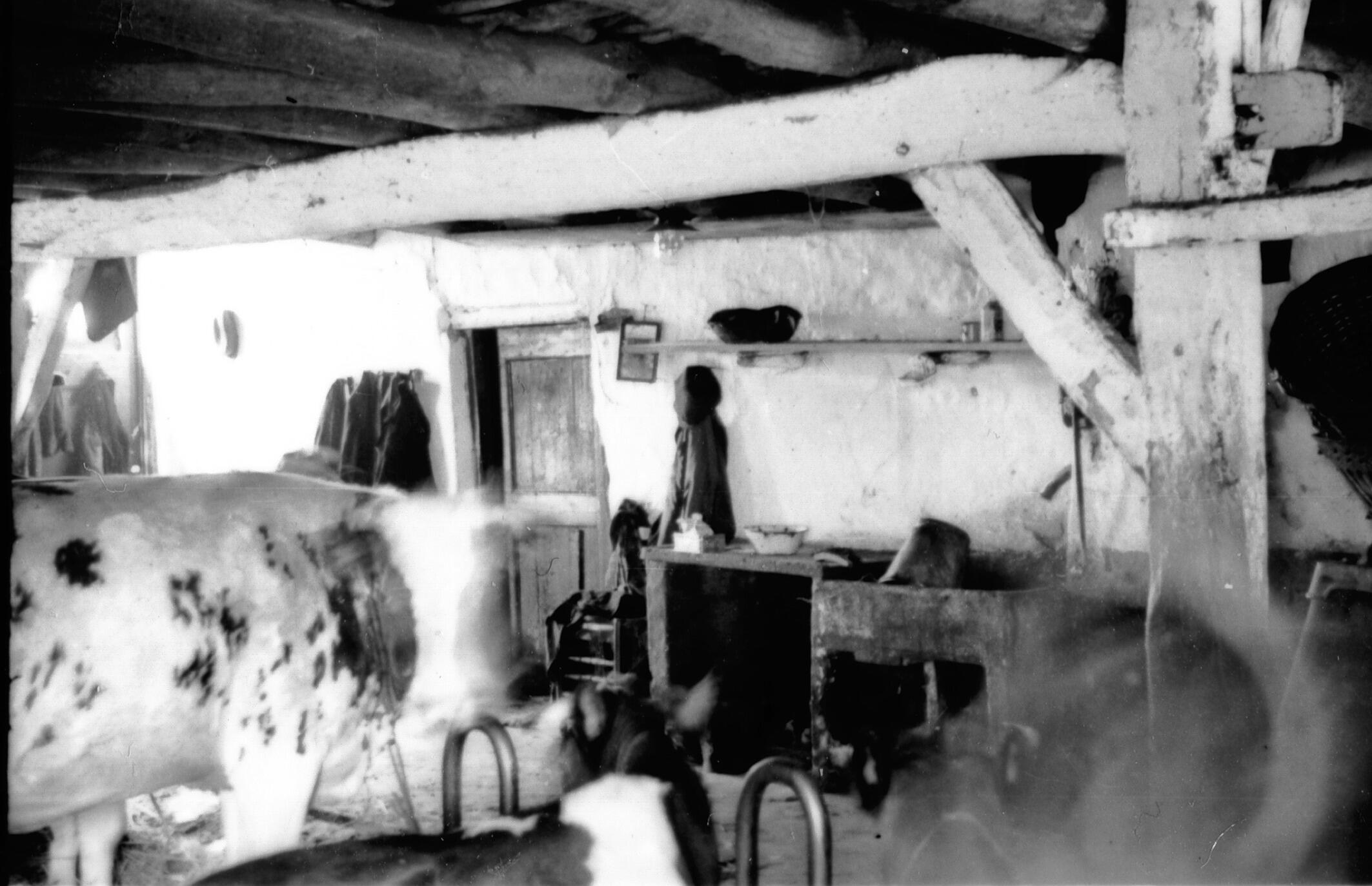 Het melken van een koe, Overwoud, 1938 (zwart-wit foto)