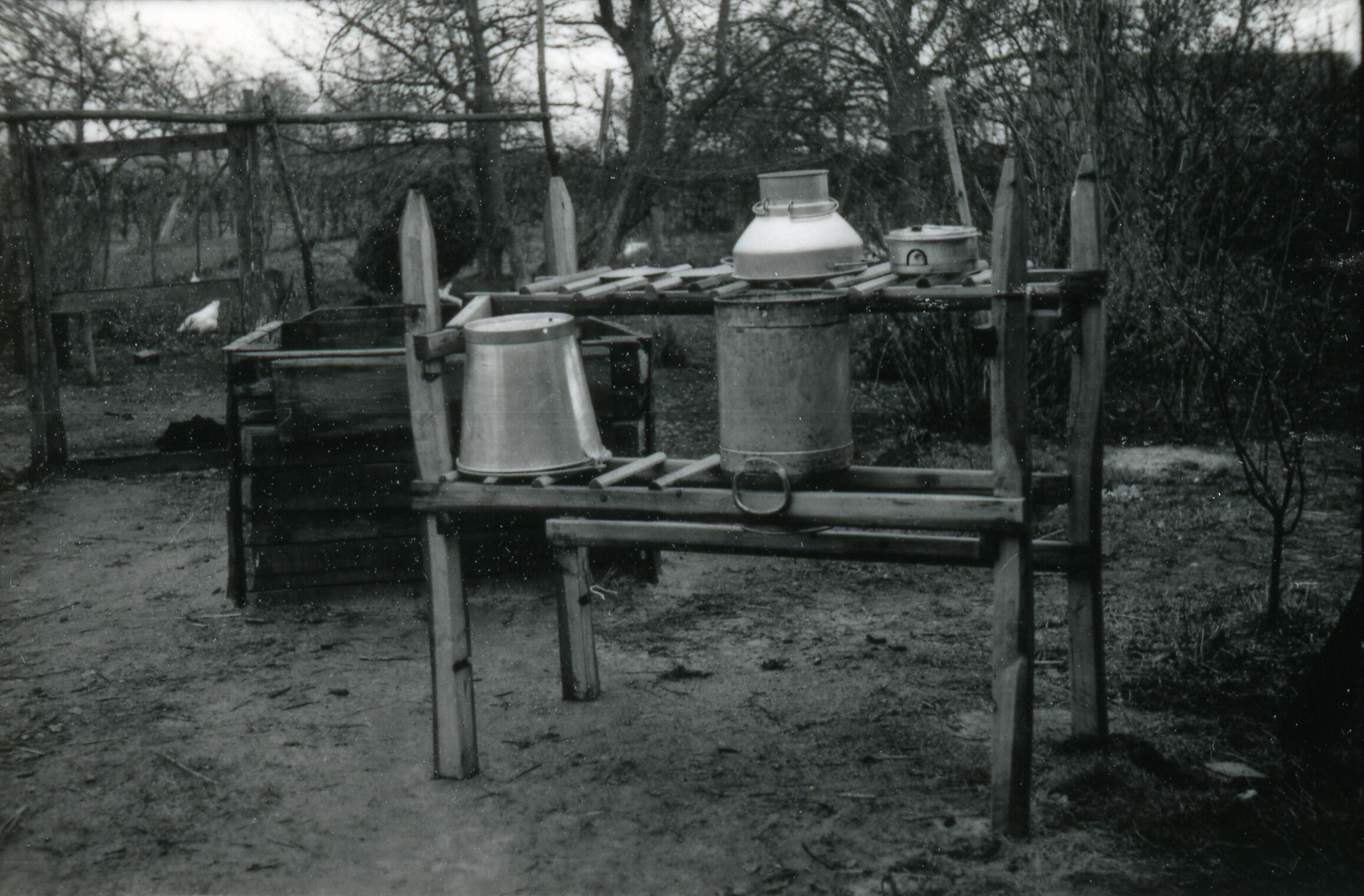Melkbussenrek naast een waterput, Deurne, 1940 (zwar...