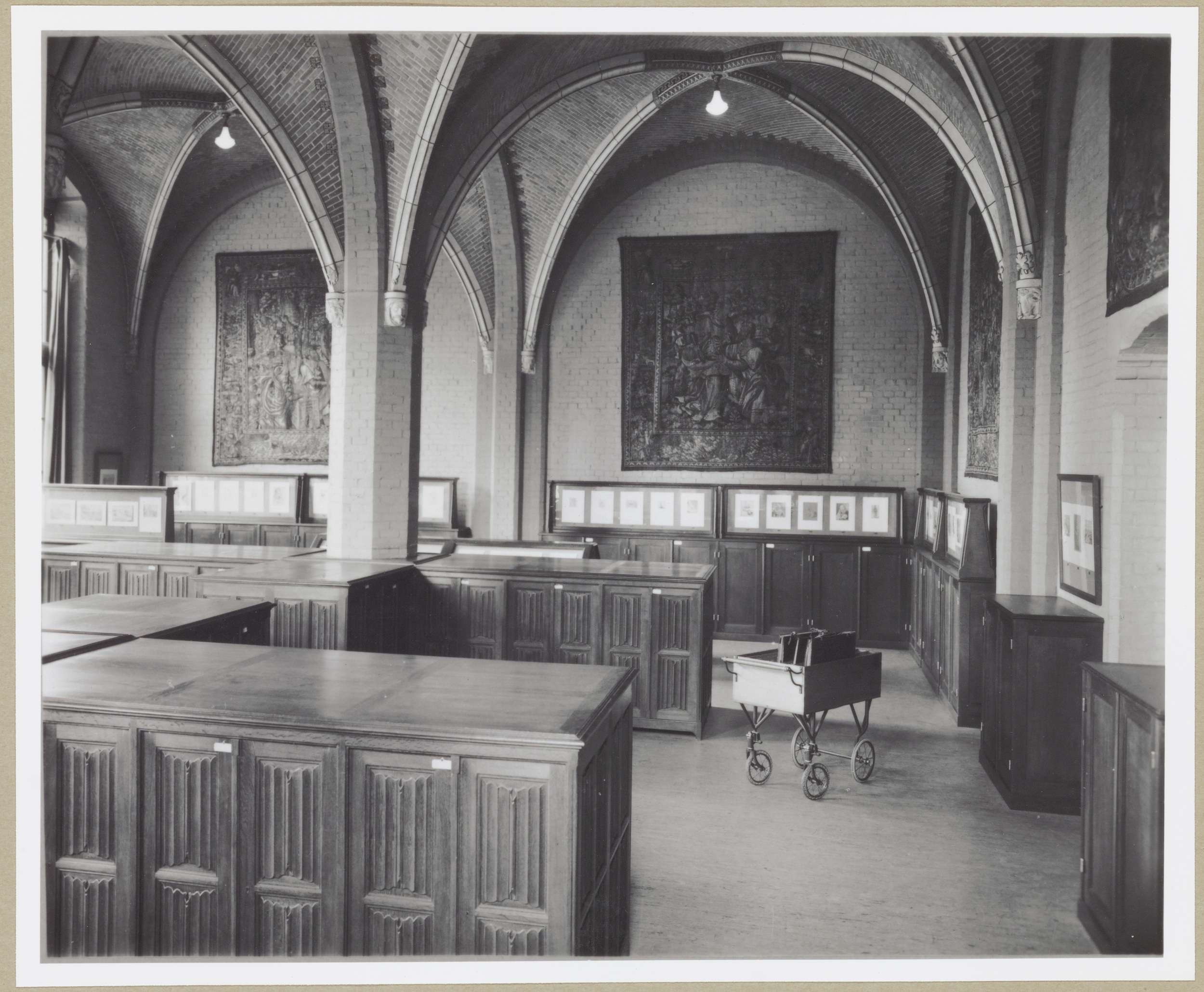 Zaal van het Rijksprentenkabinet met halfhoge kasten...