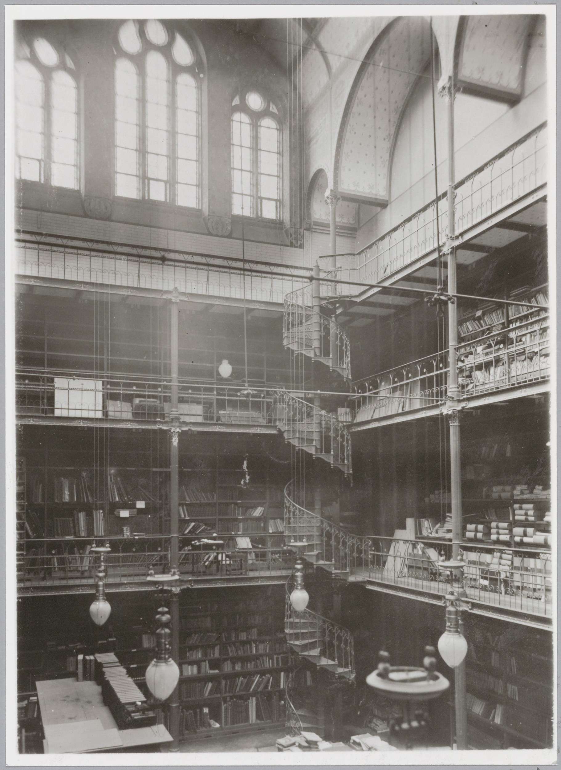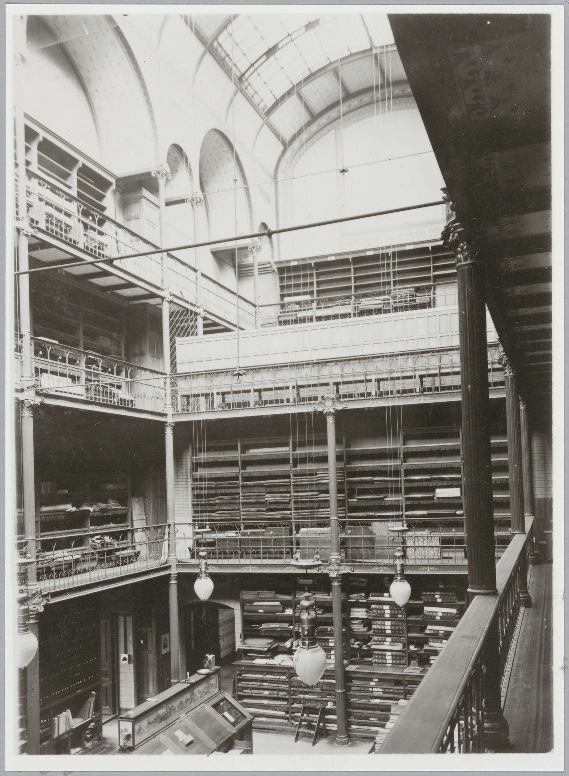 Centrale hal met boekenkasten en galerijen