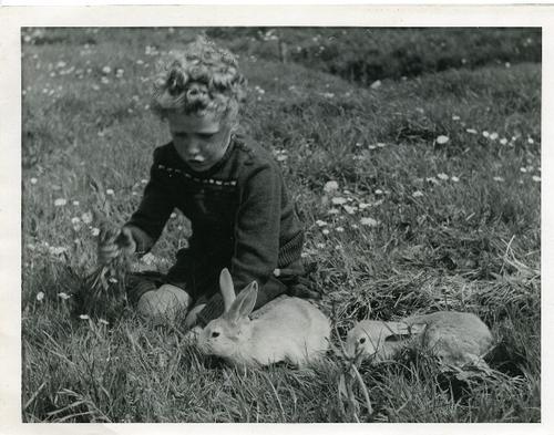 Foto in zwart-wit van een kind met twee konijnen in ...