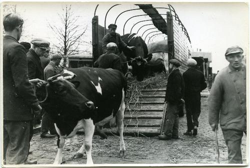 Foto in zwart-wit van het uitladen van koeien uit ee...