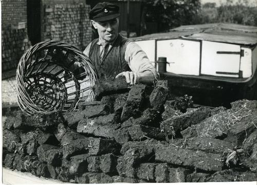 Foto in zwart-wit van turfwinning in een hoogveengeb...