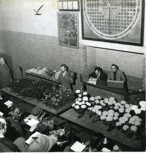 Foto in zwart-wit van de bloemenveiling door J.D. de...