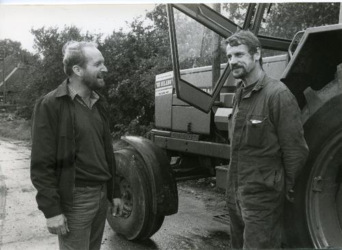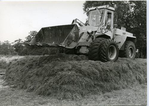 Foto in zwart-wit van een Riecam bietenrooier door F...