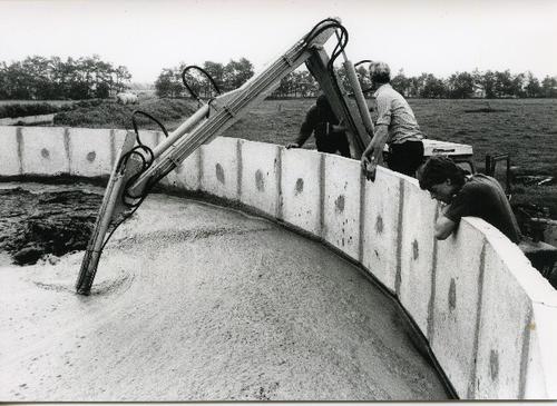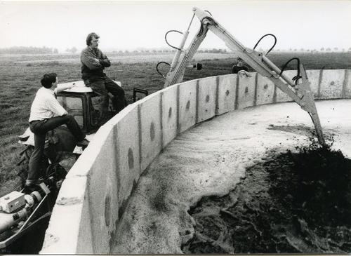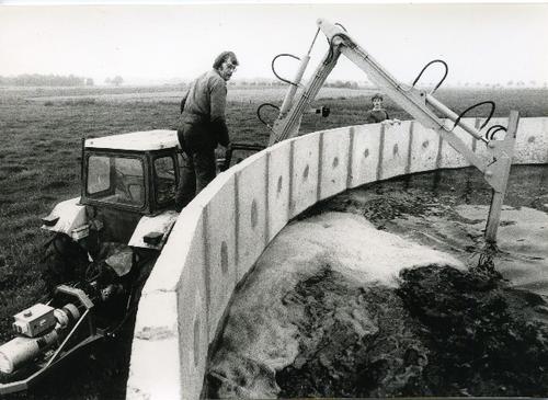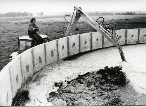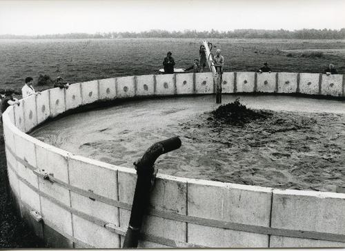 Foto in zwart-wit van een betonnen mestbassin door J...