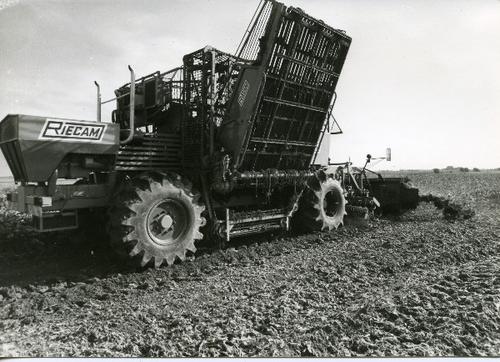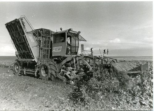 Foto in zwart-wit van een bietenrooier, merk Riecam ...