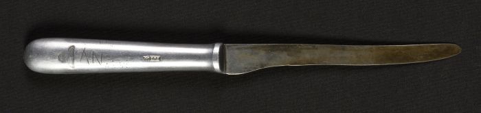 Mes met doorgekrast hakenkruis en adelaar, van Nicol...