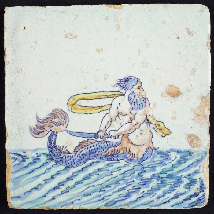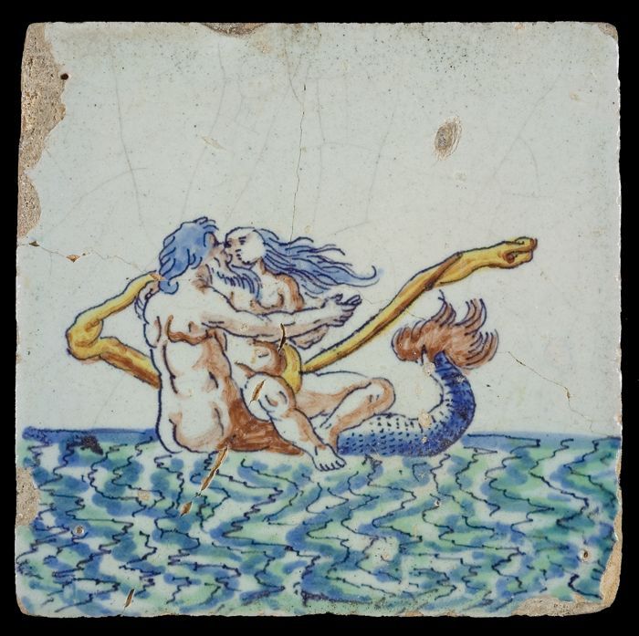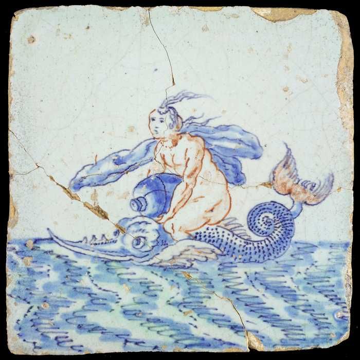 Tafereeltegel, Nereide met kruik zittend op een vis
