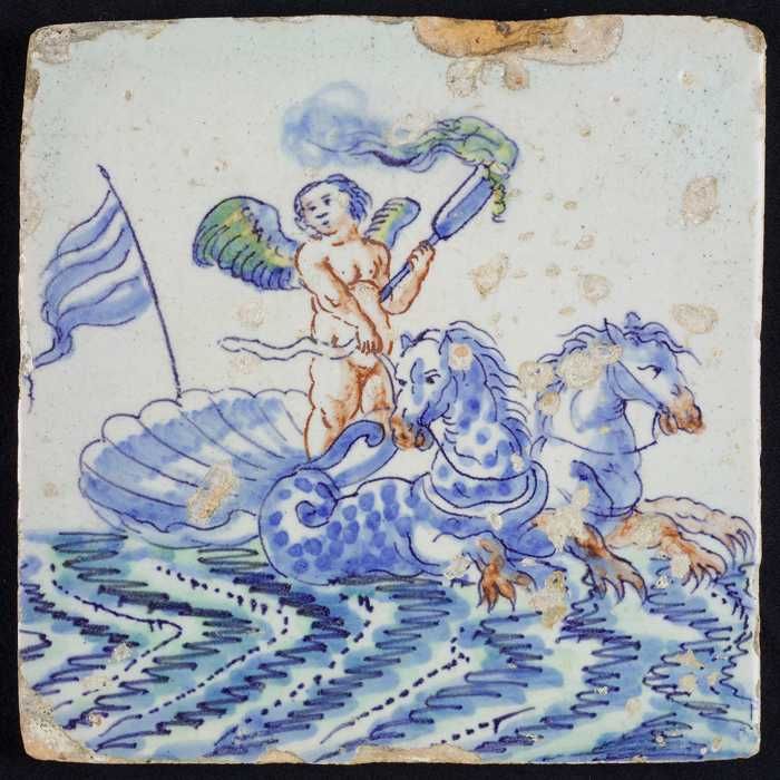 Tafereeltegel, Amor met toorts op een schelp staand ...