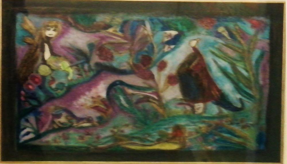 Ingekleurde ets met fantasiefiguren
