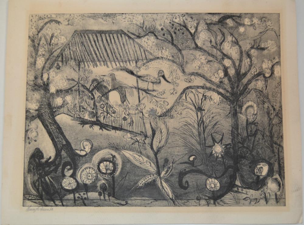 Ets met voorstelling van fantasievogels en planten