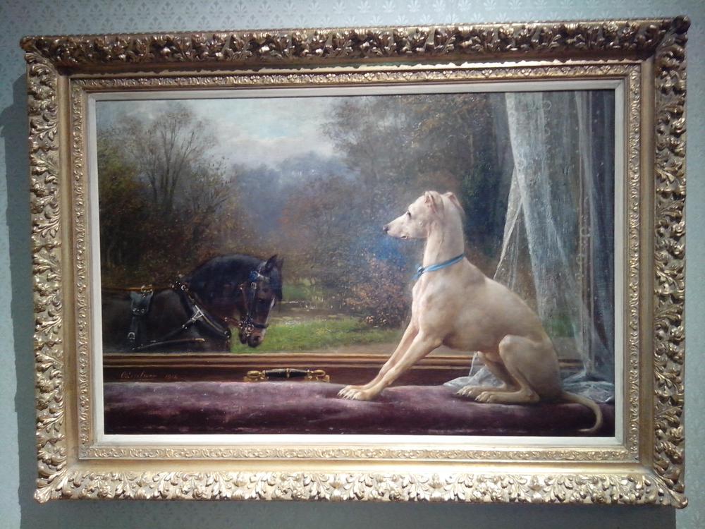 Whippet op vensterbank met Fries paard op de achterg...