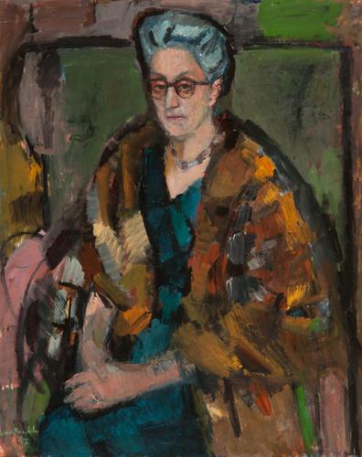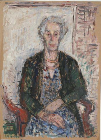 Portret van een vrouw zittend in een stoel.