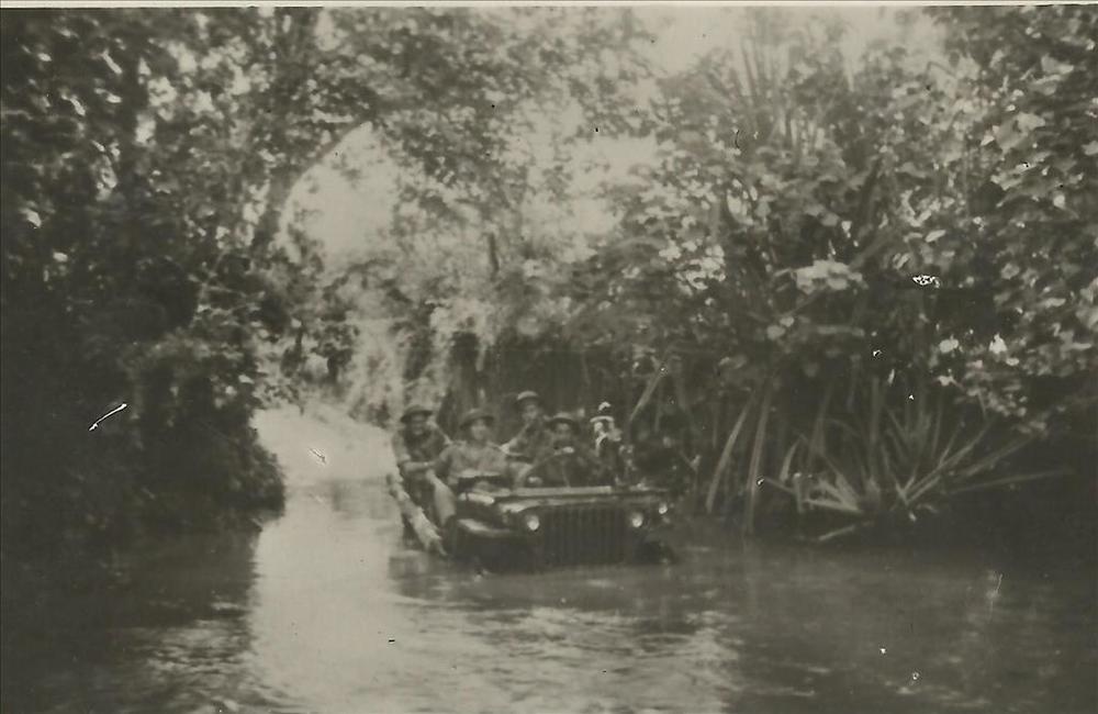 Ned. Indië na WO 2; voertuig, jeep, kali, rivier