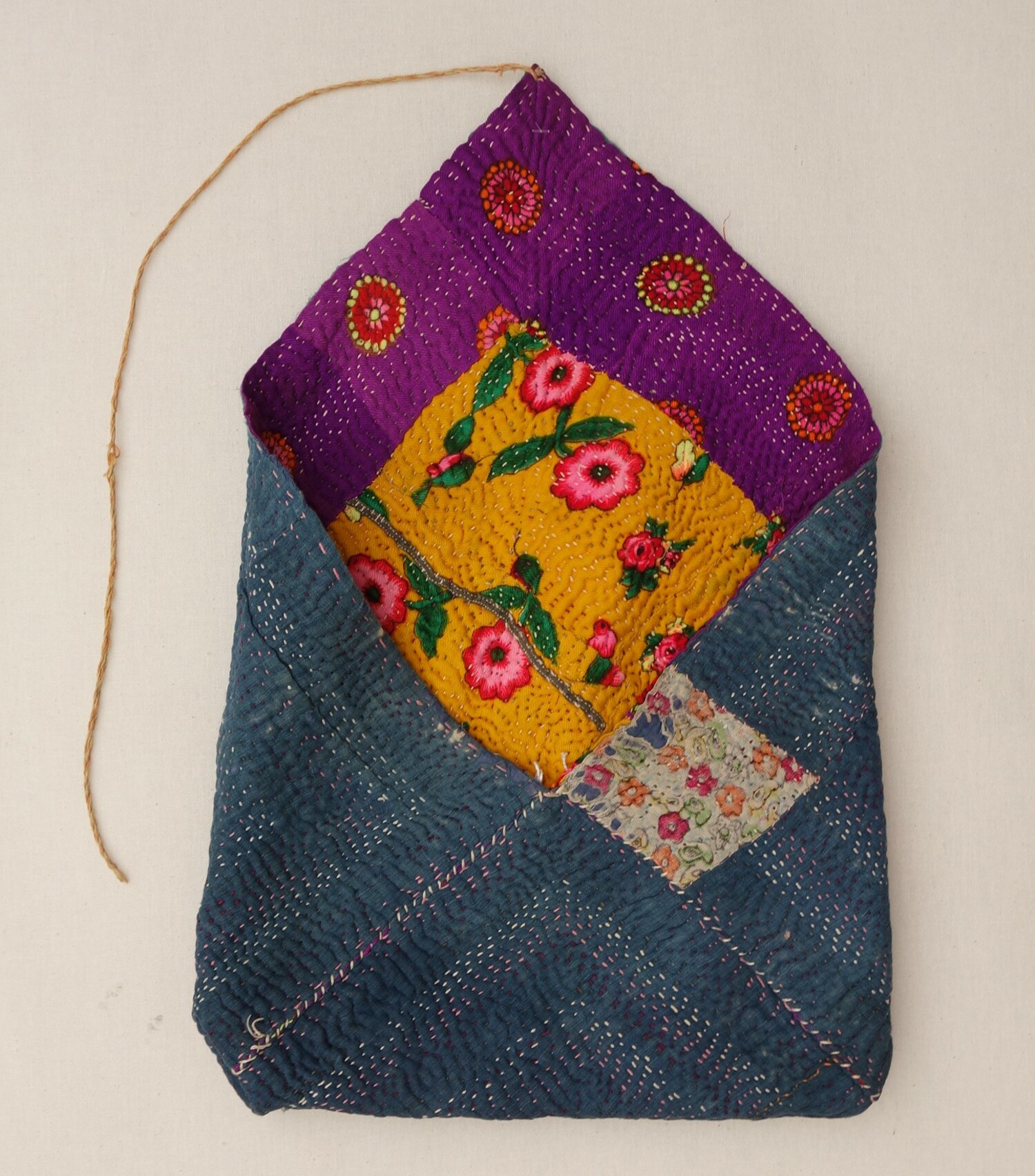 Factory woven and printed cloth hand stitched (running stitch stem stitch) pieced (1)