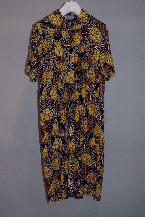 Geel met zwart/beige/groen/rood en wit bedrukte japon