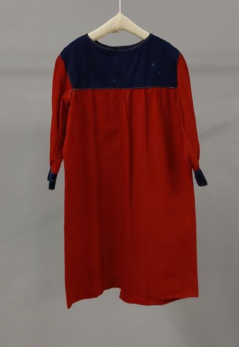 Rood kinderjurkje met blauwe schouderpas en blauwe m...