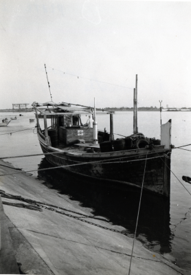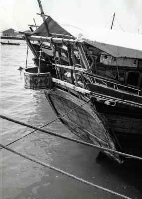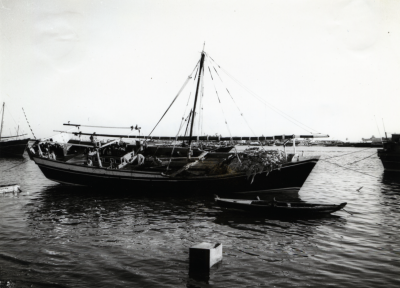 Een Jalbût, afgemeerd, stuurboordzijde, van voren ge...