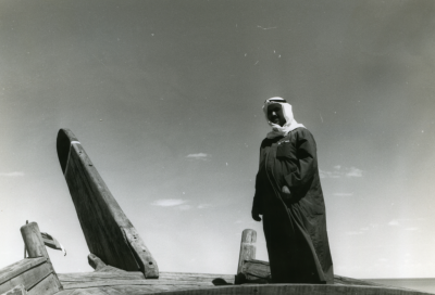 Een man in boernoes aan boord van een Bûm.