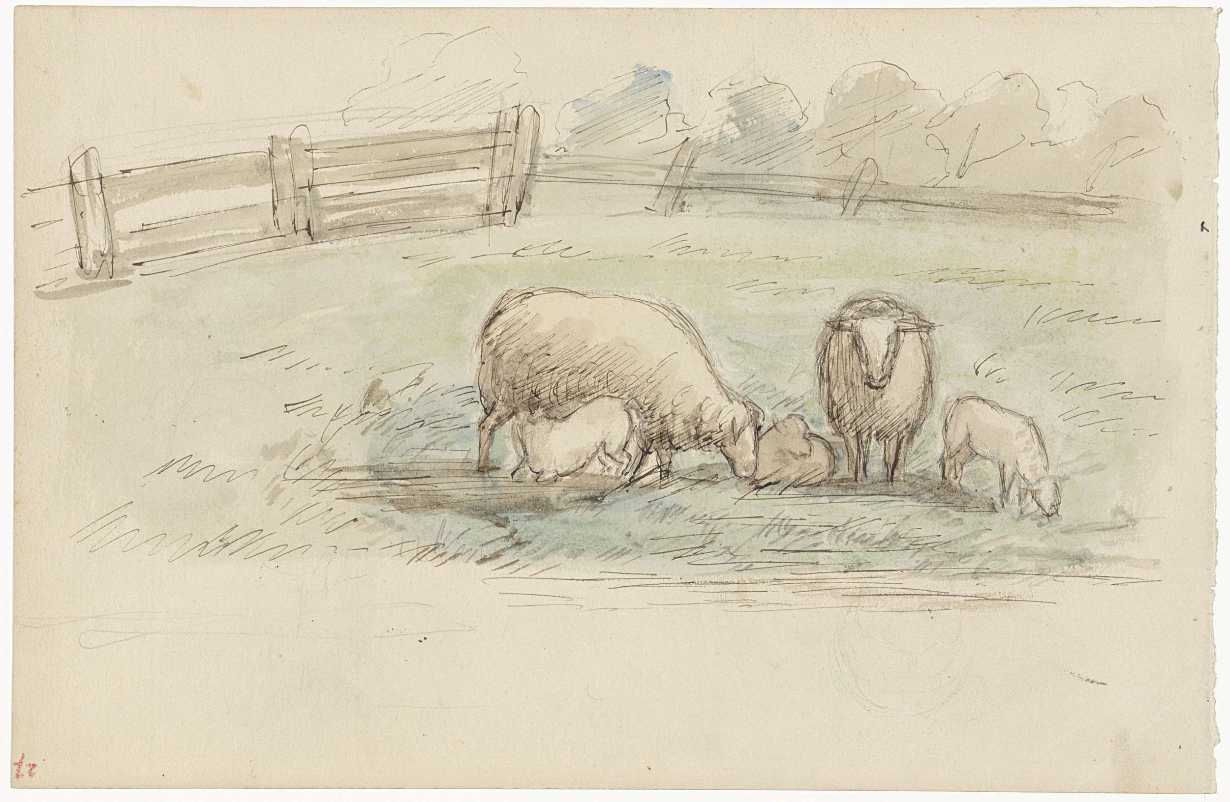 Vlakte met schapen, op de achtergrond ruïnes van een...
