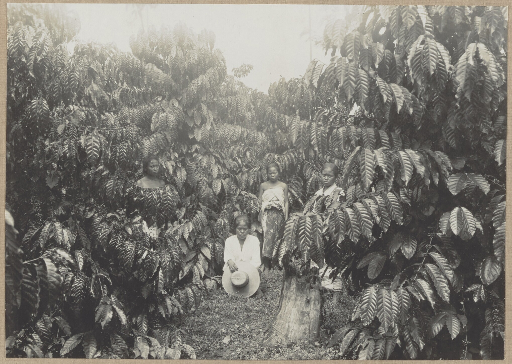 Jonge rubberbomen op ontgonnen terrein van de koffie...