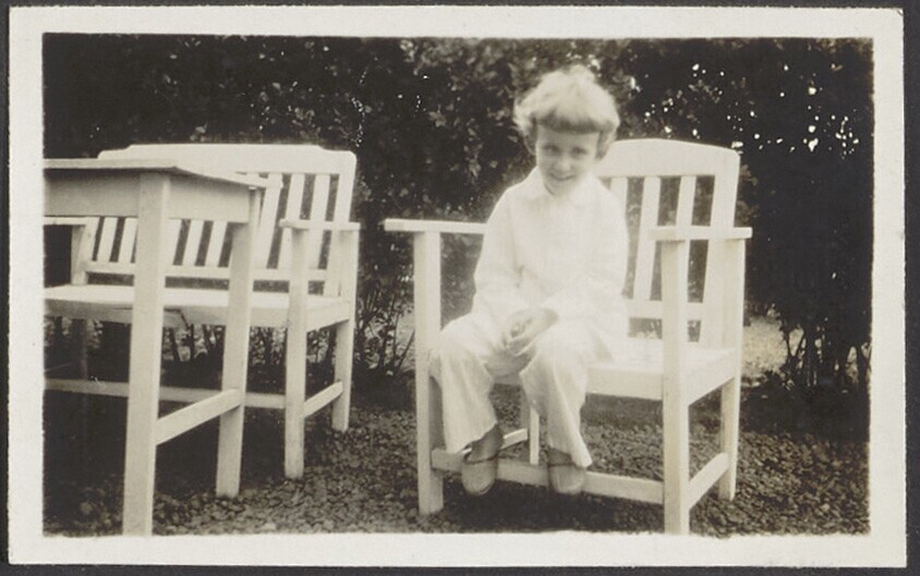 Europees kind op stoeltje in de tuin