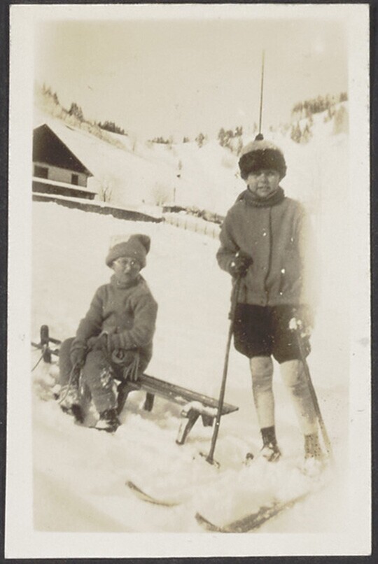 Europese kinderen in de sneeuw, met slee en skies, i...