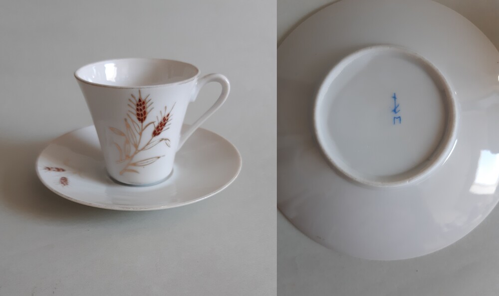 Kop en schotel met twee goudkleurige helmen en bruin...